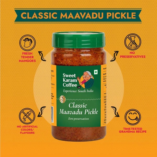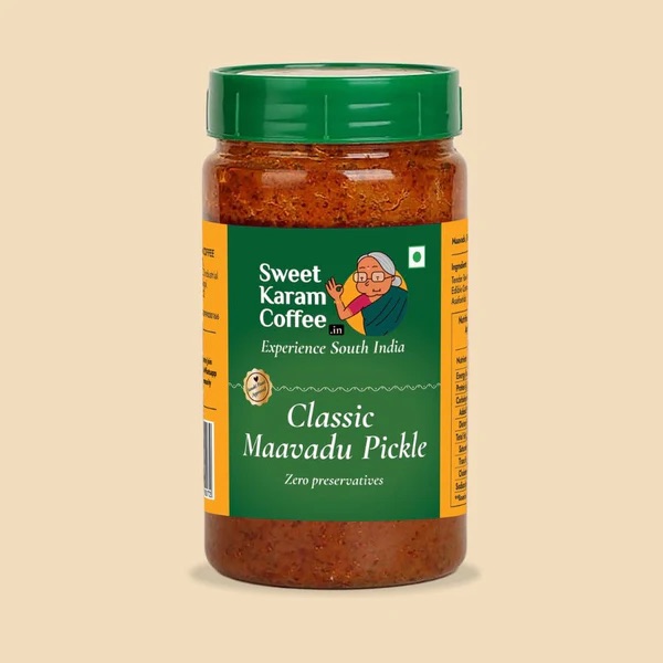 Introduce a zesty twist to every meal with Sweet Karam Coffee’s Classic Maavadu Pickle. Prepared from raw, tender mangoes, this traditional pickle provides you with an authentic and unique flavour that will elevate any meal.