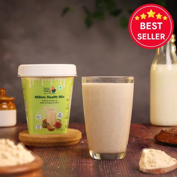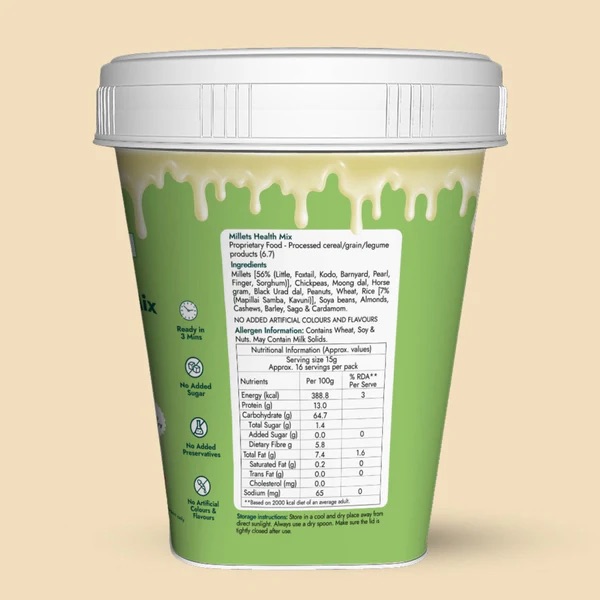 Ingredients: Millets (Little, Foxtail, Kodo, Barnyard, Pearl, Finger, Sorghum), Chickpeas, Moong dal, Horse gram, Black Urad dal, Peanuts, Wheat, Rice (Mapillai Samba, Kavuni), Soya beans, Almonds, Cashews, Barley, Sago, Cardamom.
