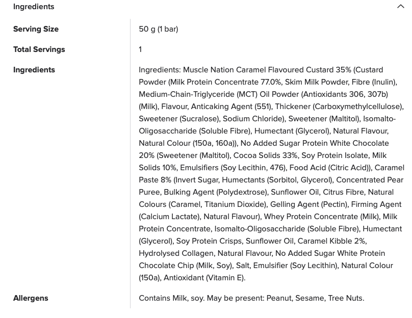 Nutrition and allergen information is specific to the Caramel flavour. For detailed allergen and nutritional information for other flavours, please visit the respective product pages. (https://musclenation.org/)