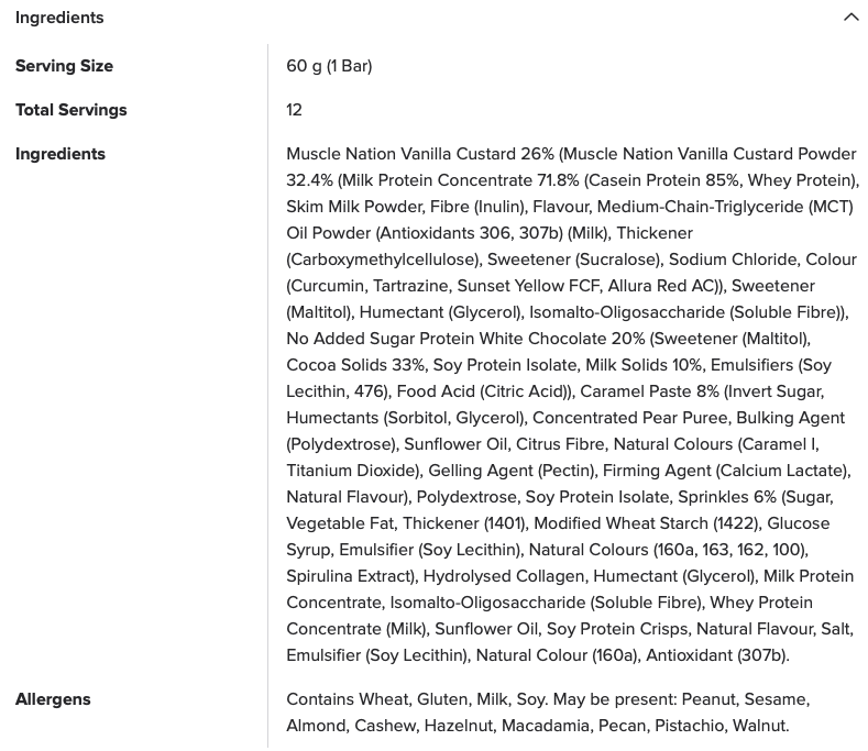 For detailed allergen and nutritional information, please visit the respective product pages. (https://musclenation.org/)